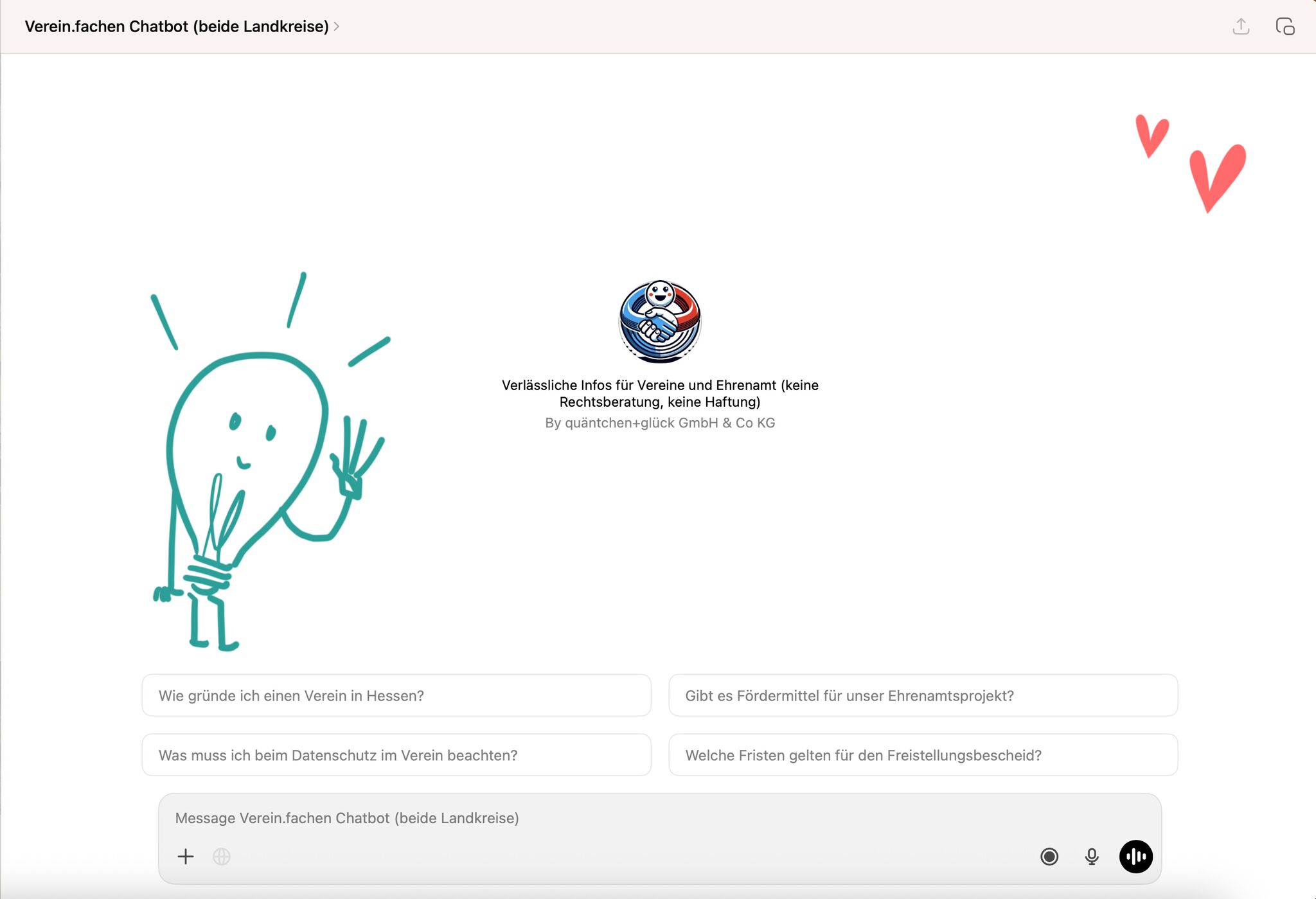 Fördermittel? Datenschutz? Vorstandskram? Für all das wurde im Projekt „verein.fachen“ ein Chatbot für Ehrenamtliche gebaut. Der Clou: Wir bauten ihn nicht nur für, sondern mit den zukünftigen Nutzer*innen. Durch viele gemeinsame Feedbackrunden wurden Sprache und Fragen direkt aus dem Alltag integriert. So entstand ein praktisches, wenn auch nicht rechtssicheres Tool, das durch echte Co-Creation überzeugt. Über die Vor-, Nach- und Potenzialteile denkt Theresa in ihrem Linkedin-Beitrag nach