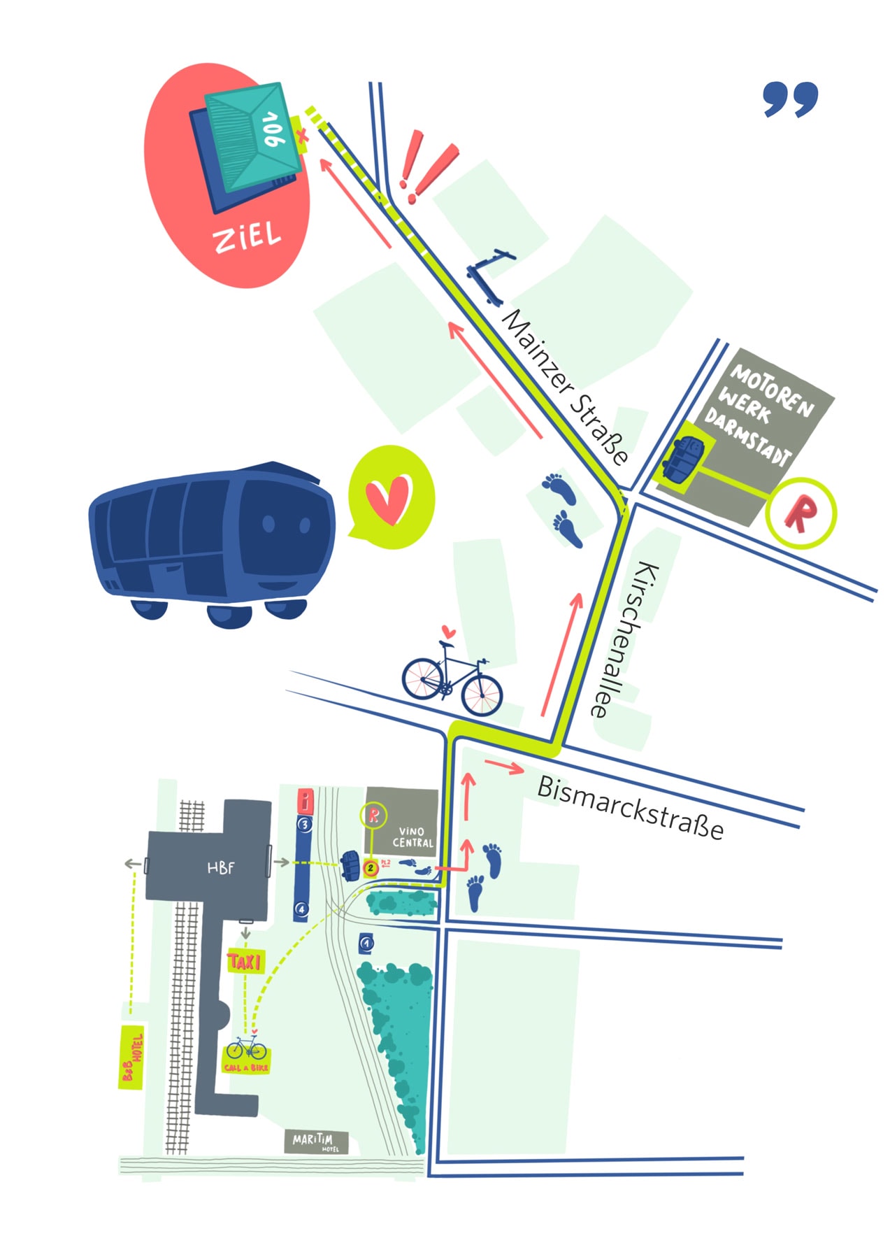 Uns erreichen Sie am besten mit öffentlichen Verkehrsmitteln. Der Darmstädter Hauptbahnhof ist nur 1,7 Kilometer entfernt. Der R-Bus fährt alle 10 Minuten und bringt Sie in 3 Minuten ab Hauptbahnhof bis Haltestelle Mainzer Straße (Richtung Nordbahnhof). Ein anschließender 8-Minuten-Spaziergang durch, nennen wir es doch einfach urbane Industrieromantik führt Sie, die Mainzer Straße hinunter, bis zu uns in die queststadt.