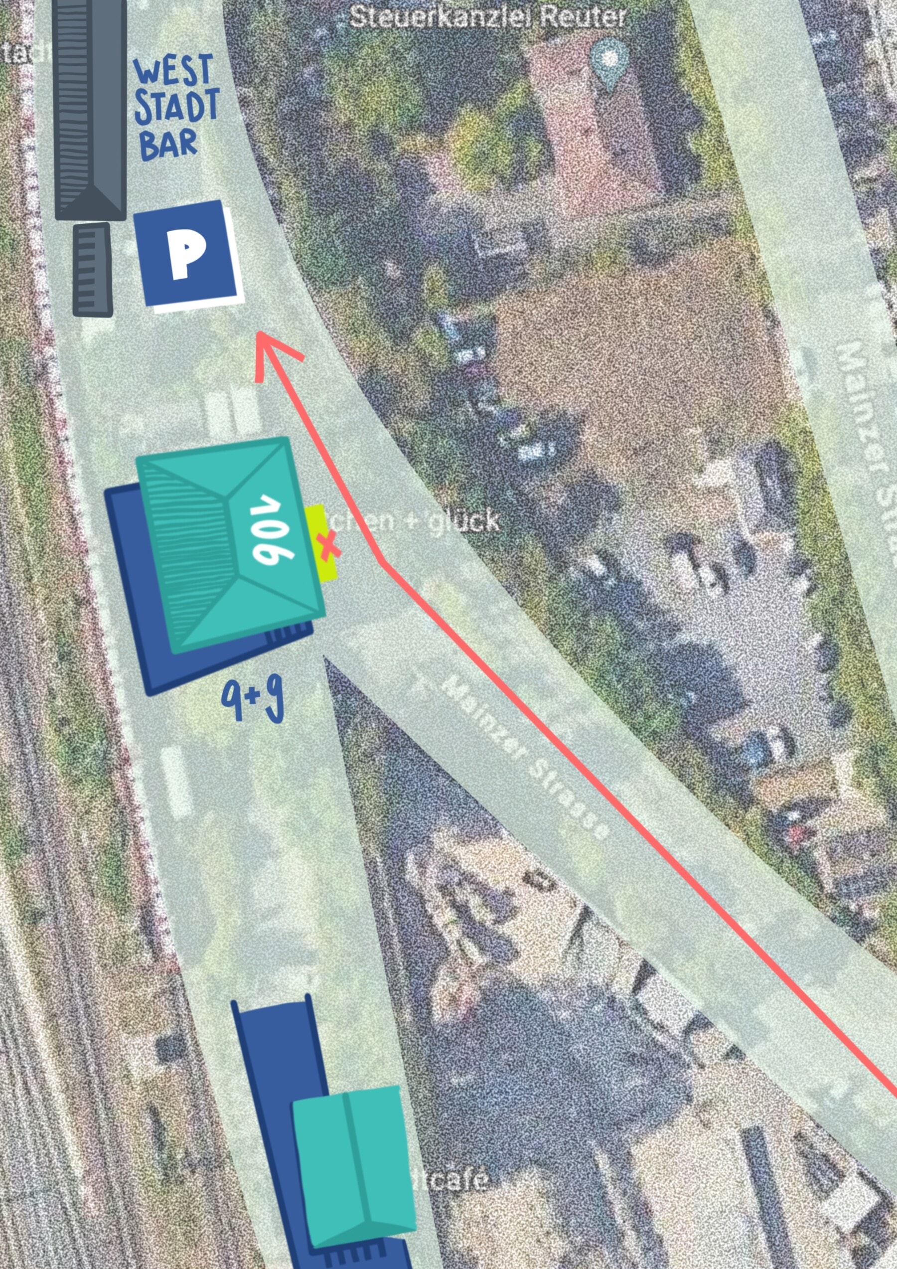 Teilweise zeigt Google Maps einen Weg über die Gleise an – dieser existiert nicht! Gehen Sie immer über Poststr. > Bismarckstr. > Kirschenalle > Mainzer Str.