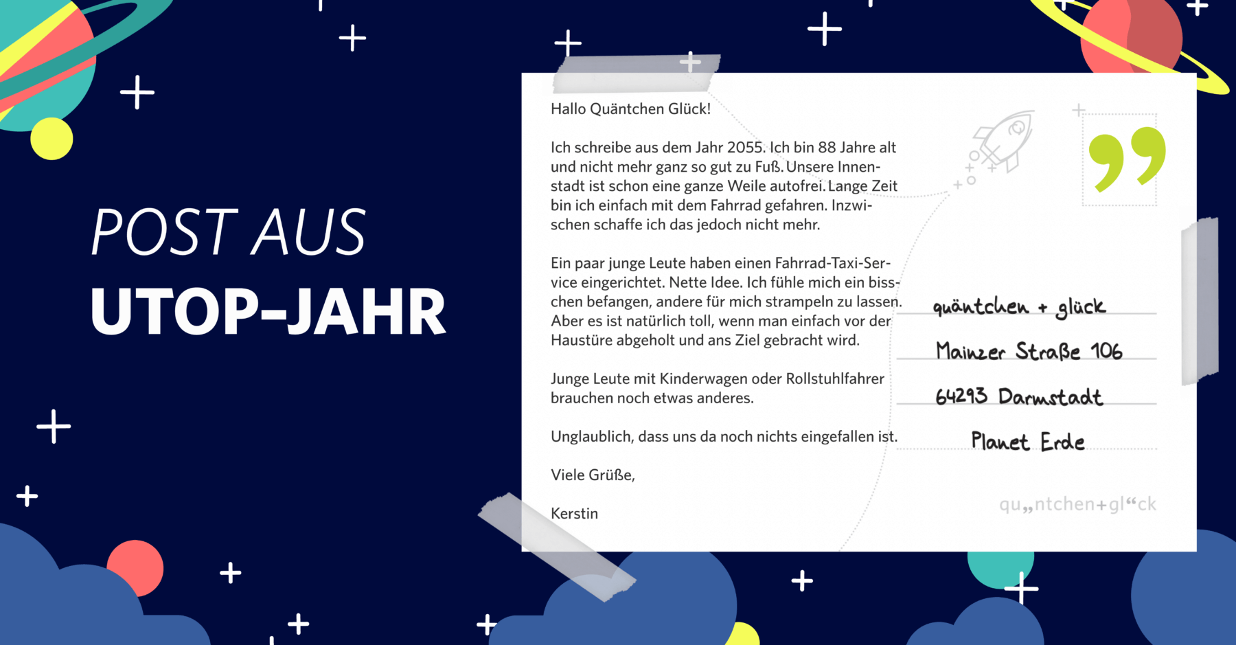 Das große Preisausschreiben ist vorbei und der Workshop terminiert (Grüße gehen raus an die zehn Gewinner*innen!) – aber die Postkarten inspirierten uns nachhaltig. Sie erzählen von gemeinschaftlichem Wohnen, lebendigen Stadtvierteln, einer Welt ohne Geschlechter-Ungerechtigkeit und mit Bildungsgerechtigkeit.