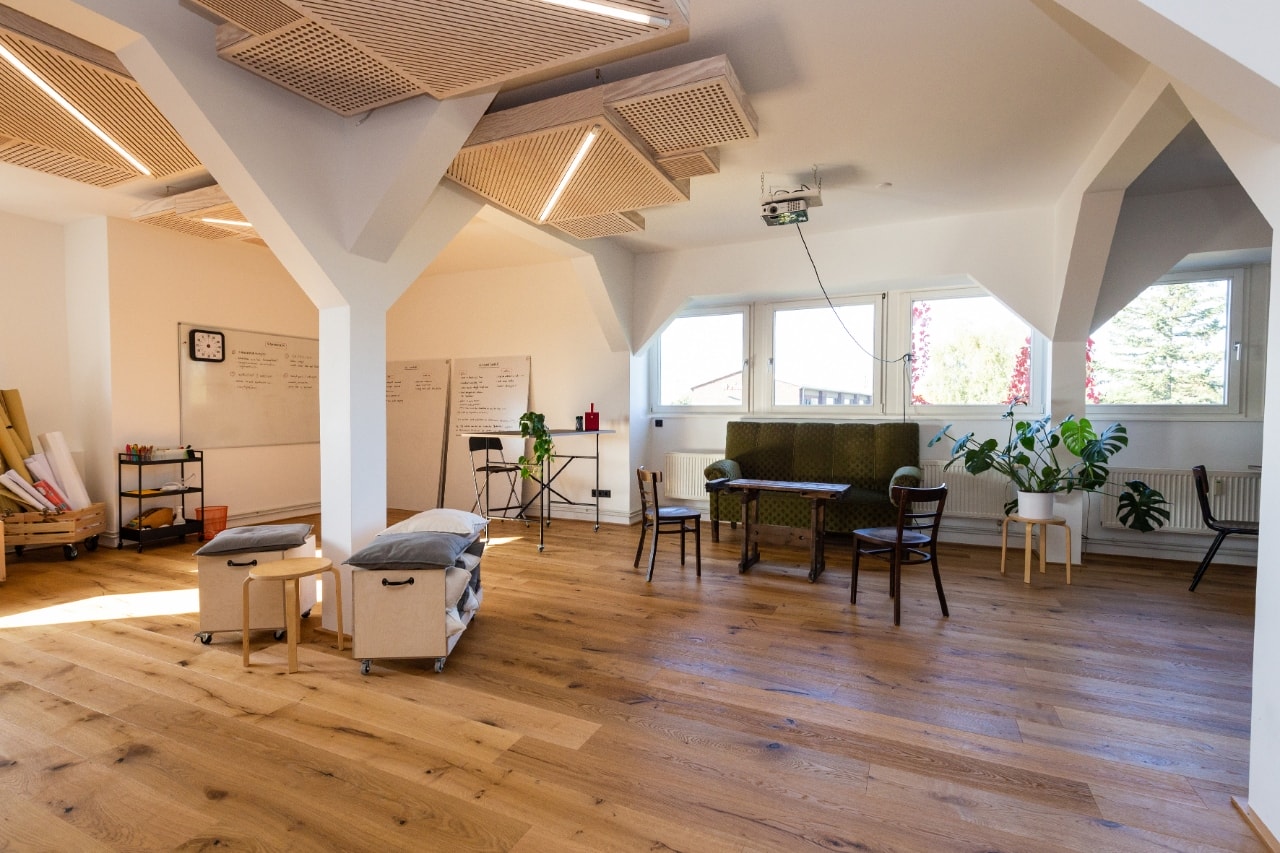Was jedoch immer noch die wenigsten wissen: Die Sonnenuntergänge gibt’s gratis dazu, wenn Sie den funktional-minimalistisch-schönen Workshop-Tanzsaal namens „Q1” für eure Workshops, Meetups, Vorträge oder Team Events mieten! Die Website dazu ist in der Mache, reservieren können Sie den Raum aber jetzt schon. Einfach eine Mail an Anna und schon können Sie sich bei uns austoben!