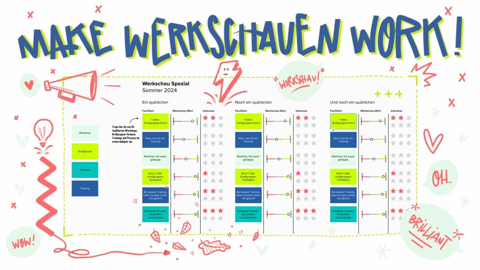 Wir wollen Werkschauen in Zukunft in Kategorien (Trainings, Workshops, Events, Prozesse) einteilen um mehr Fokus und weniger Themenwechsel hinzubekommen.